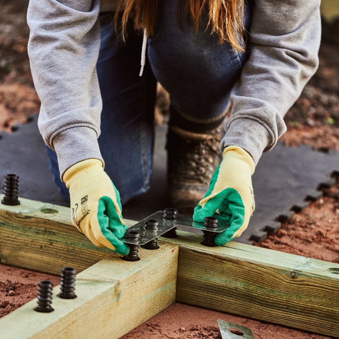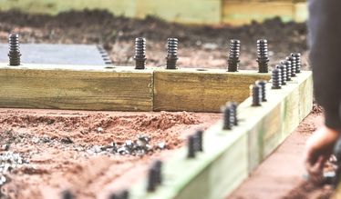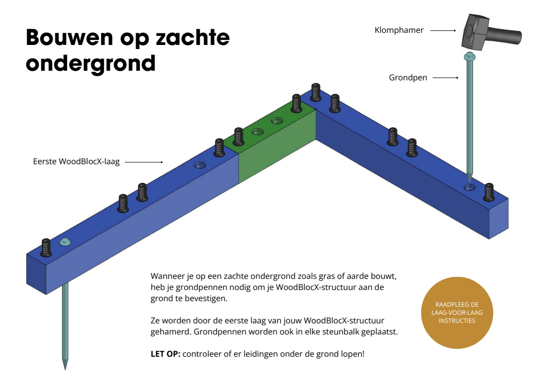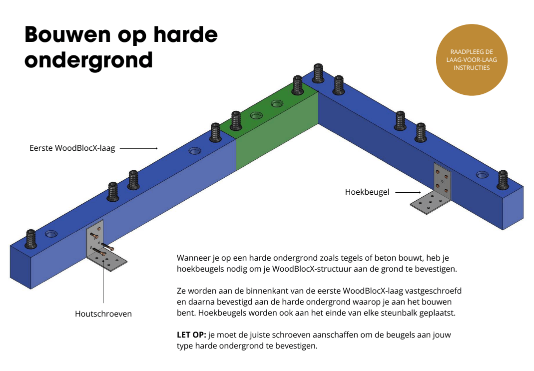 Als je rechtstreeks op aarde of gras bouwt, gebruiken we grondpennen - deze sterke metalen staven worden in de basislaag van blokken bevestigd. Het is bewezen dat de combinatie van steunbalken en grondpennen onze keermuren op hun plaats houdt. Als je rechtstreeks op beton of bestrating bouwt, leveren we hoekplaten die moeten worden vastgeschroefd in het oppervlak waarop je bouwt. Meer informatie over de grondbevestigingsopties van WoodBlocX.