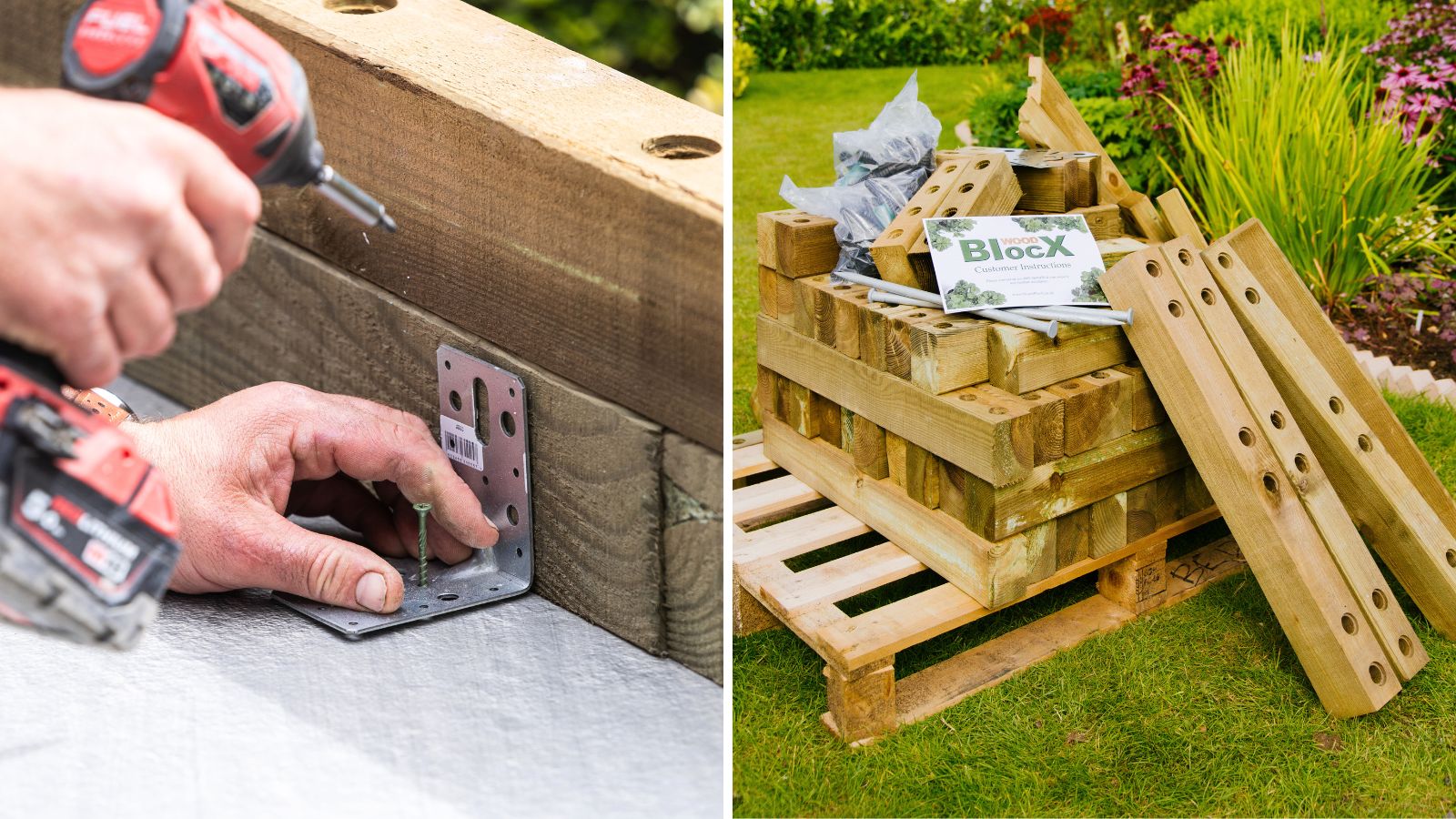 Omdat een groot deel van Barry’s tuin was aangelegd met een vlak, egaal terras was het voorbereidend grondwerk voor het bouwen minimaal. Bij het bouwen met WoodBlocX op een harde ondergrond, zoals terras of beton, bieden we hoekbeugels om de structuur aan de grond te verankeren.