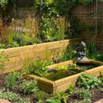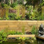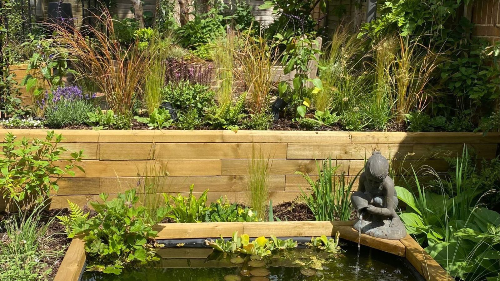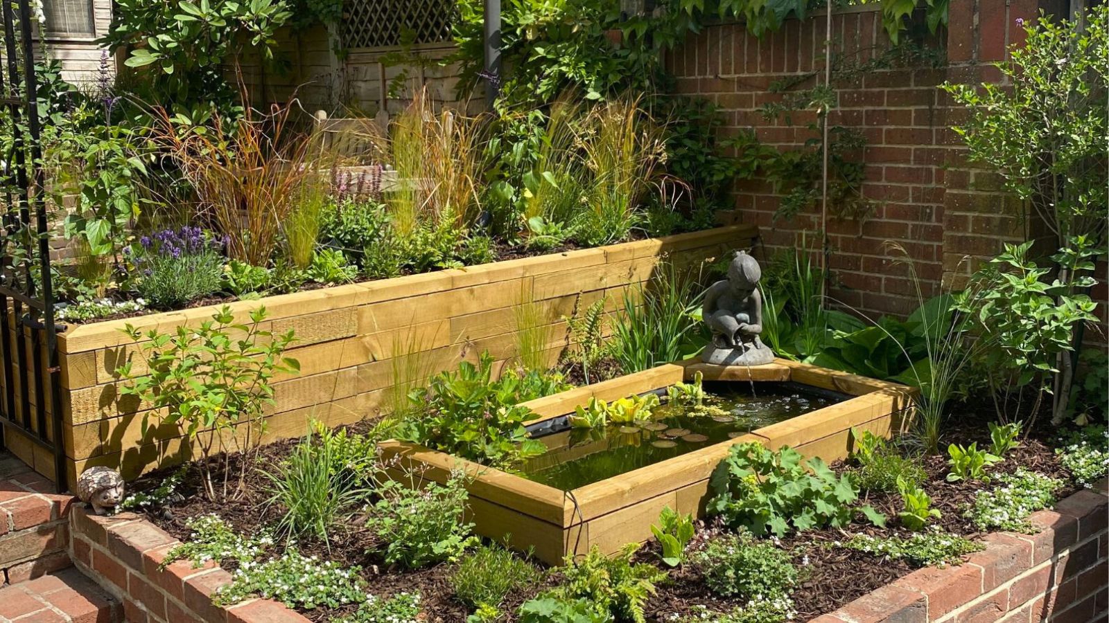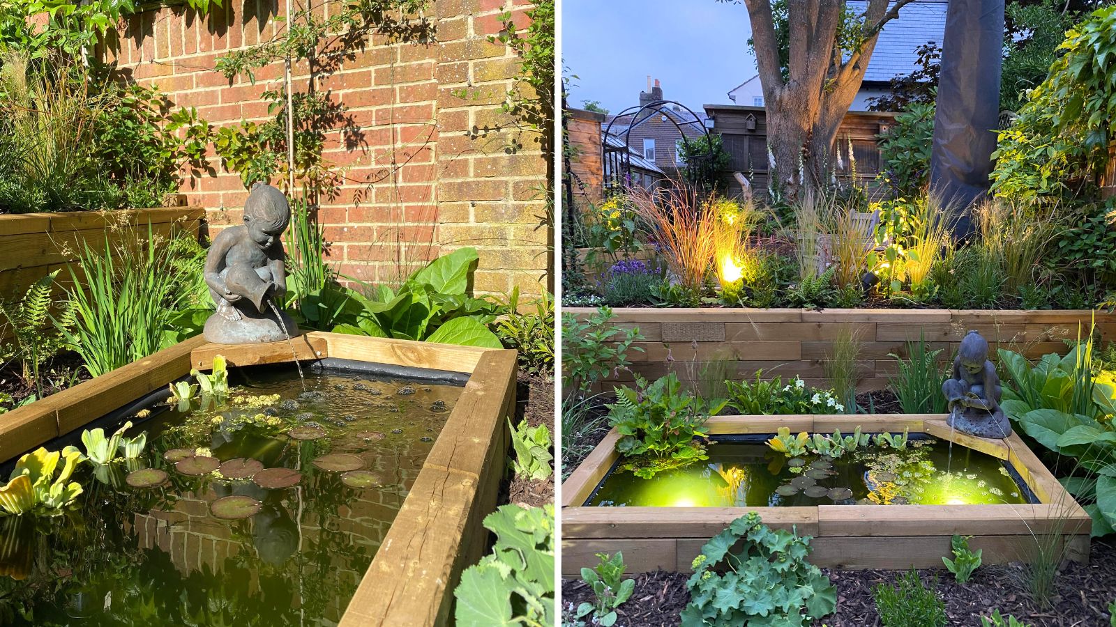 De kleine verhoogde vijver zorgt voor een rustgevende sfeer in de tuin en vormt een kleine leefomgeving voor wilde dieren in de tuin. Barry heeft een waterpartij in de hoek van de vijver gemaakt die zuurstof aan het water toevoegt en het in beweging houdt.