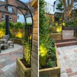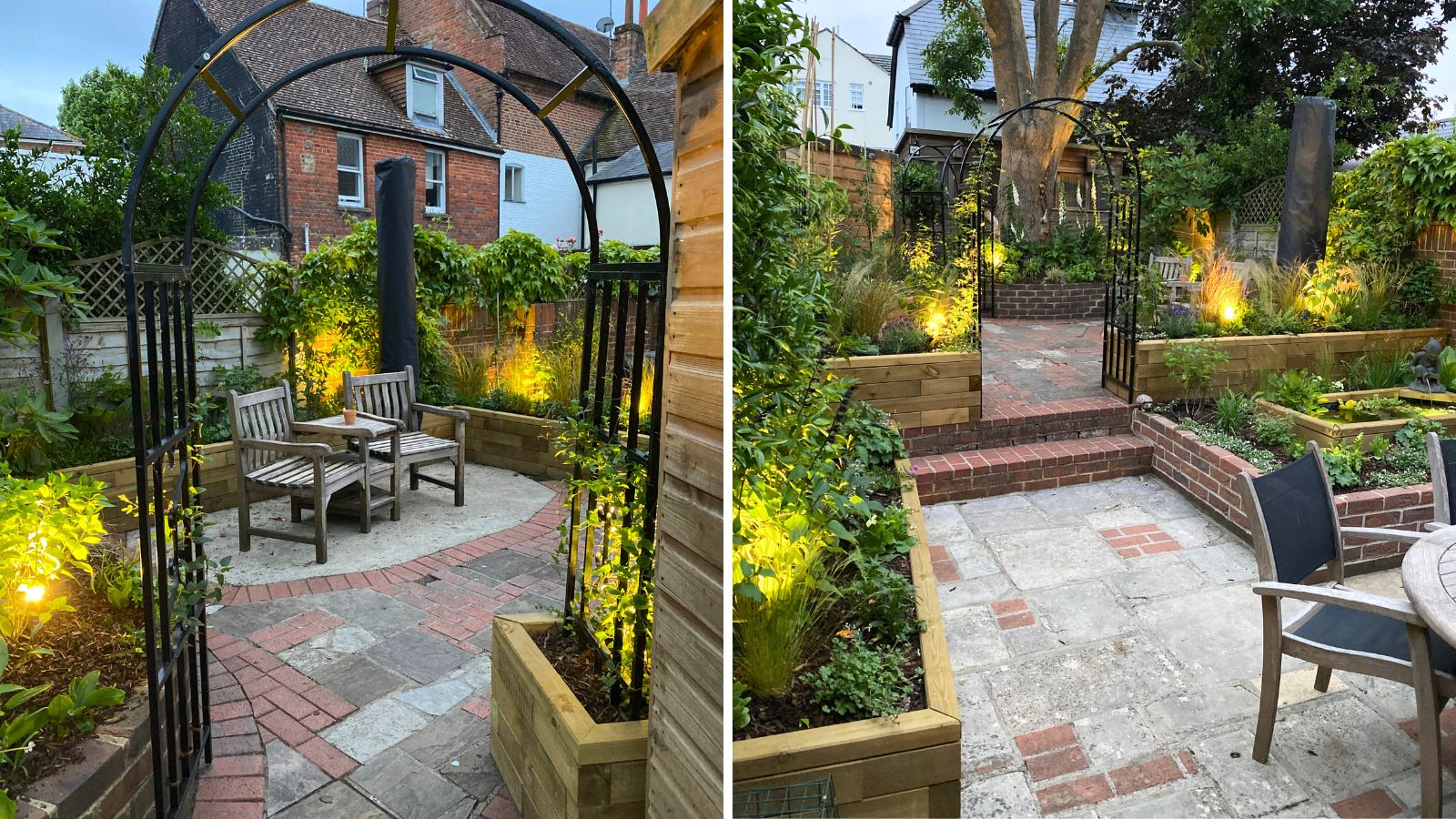 Het uiteindelijke ontwerp (overeengekomen voordat online werd besteld) zorgt voor een prachtige omkadering aan beide zijden van de tuin. De lange keerwand links doet dienst als decoratieve tuinrand die over vrijwel de hele lengte van de tuin volop beplantingsruimte biedt en bij de traptreden een niveau hoger wordt. Aan de bovenkant van deze wand is een verhoogde bak ontworpen voor een unieke vorm aan de achterkant van de tuin. Aan de rechterkant bieden een andere lange keerwand en een rechthoekige verhoogde bak ruimte voor meer beplanting en is er een kleine verhoogde vijver aangelegd in het midden van een nieuwe verhoogde bakstenen border.