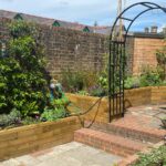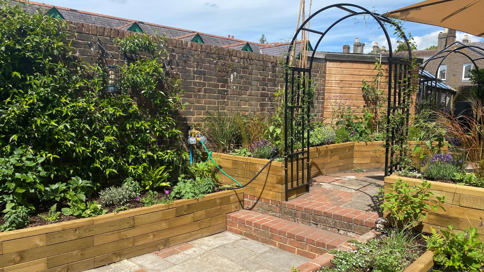 Becky’s visie was om drie afzonderlijke zones in de tuin te creëren: een vijverzone voor wildlife dichtbij het huis, een speciale zithoek omringd met winterharde beplanting en een combinatie van verhoogde bakken en borders aan de rand. Becky wilde ook een metalen tuinboog bij de traptreden plaatsen die tussen twee WoodBlocX-structuren moest worden bevestigd.