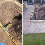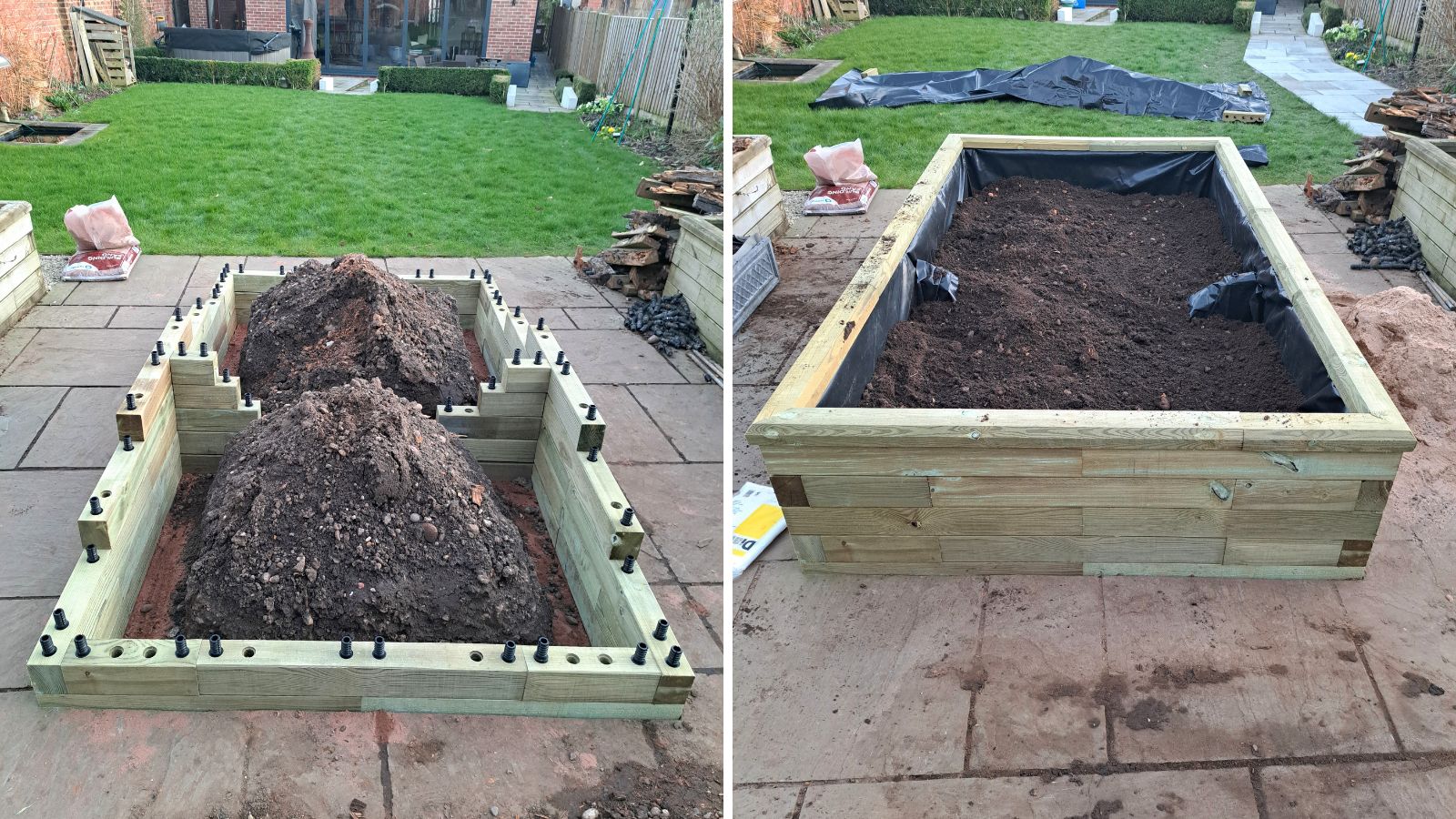 Voordat Ian de eerste rij WoodBlocx legde, zorgde hij ervoor dat de grond volledig vlak was, omdat het van cruciaal belang is om op een vlakke ondergrond te bouwen. Daarna bracht Ian een beschermende voering aan als extra bescherming die een barrière vormt tussen het hout en de grond, waardoor de levensduur van de verhoogde bak wordt gegarandeerd. Voordat hij de laatste afdekkingslaag toevoegde zorgde Ian ervoor dat de voering voor de verhoogde bakken was aangebracht.