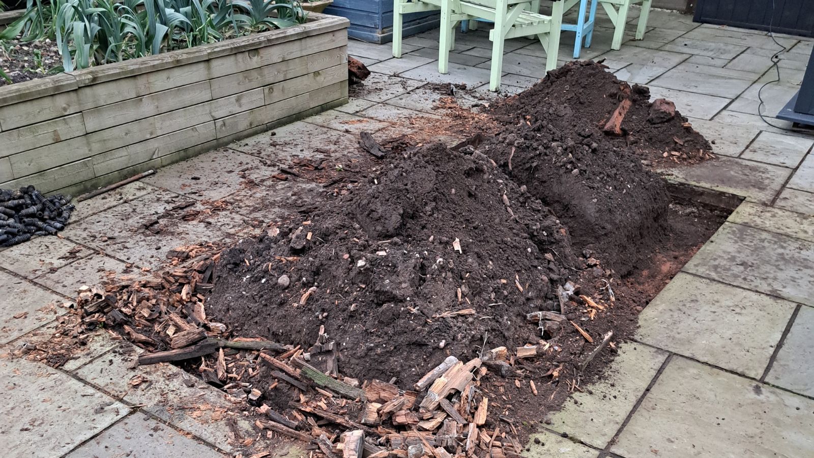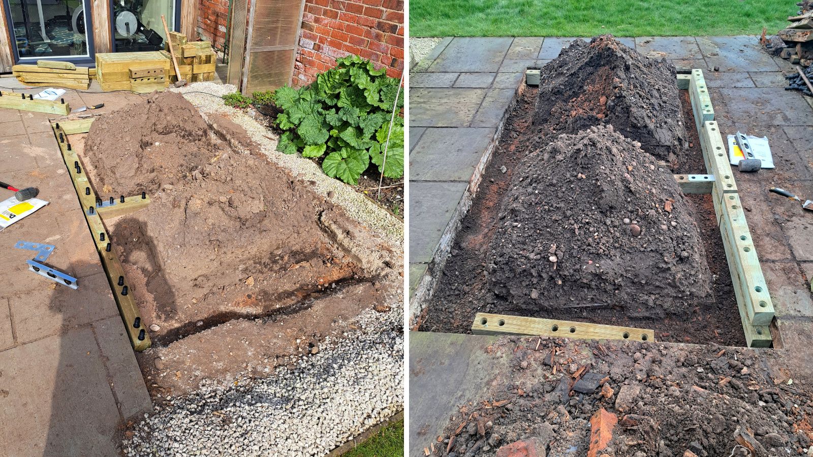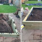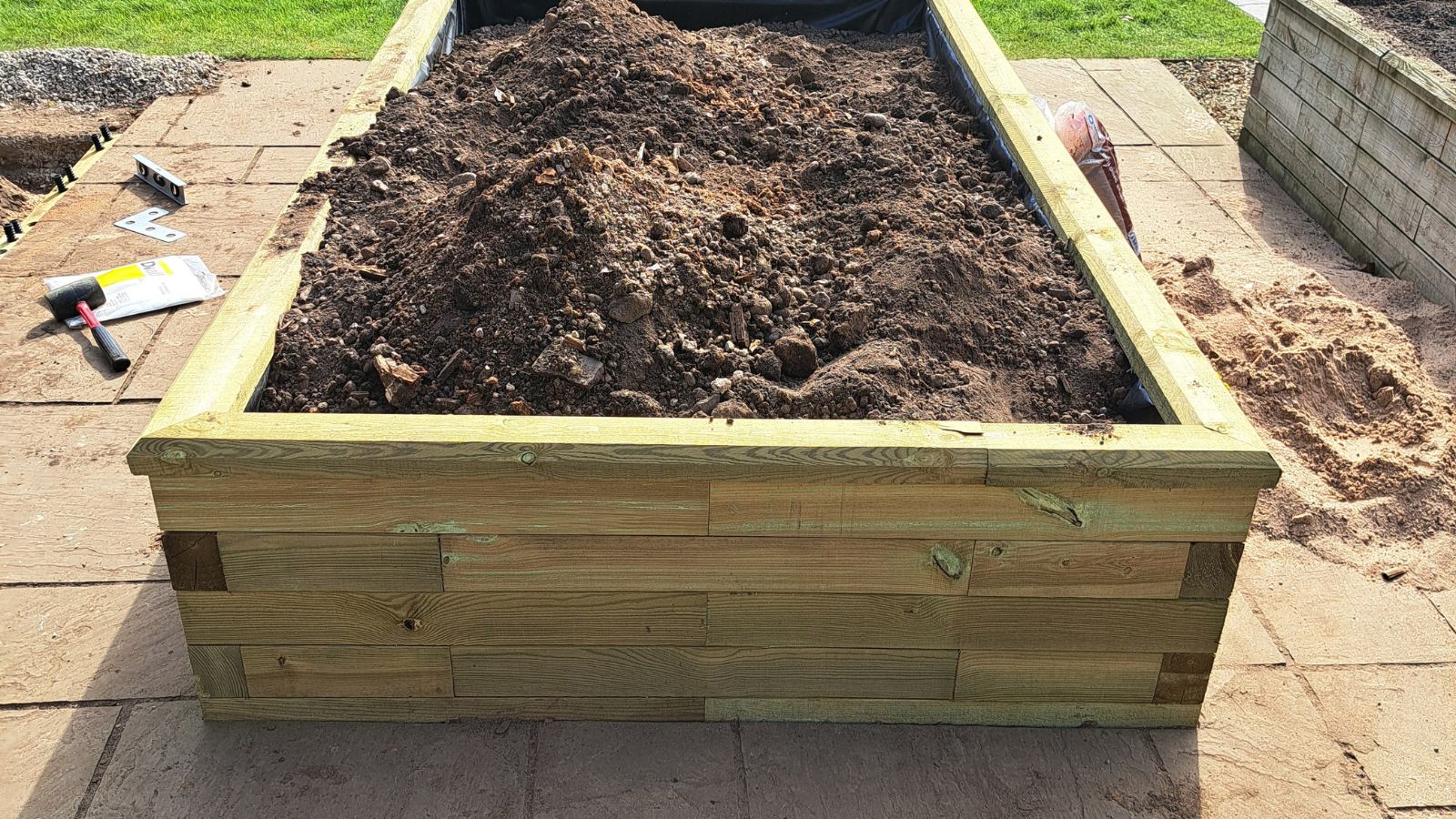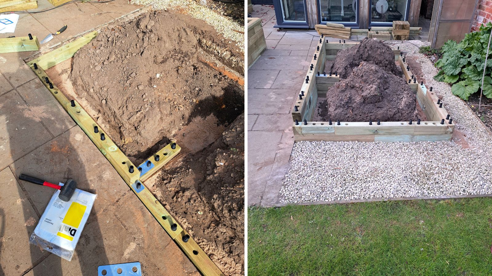 Om de grond voor te bereiden werden allereerst terrastegels verwijderd om op de zachte ondergrond te bouwen. Voor dit grondtype bieden we grondpennen om de verhoogde bak te verankeren. WoodBlocX kan op elke ondergrond worden gebouwd; wij bieden hoekbeugels om onze kits aan harde grondtypen, zoals beton, bestrating en terrassen te bevestigen.