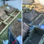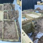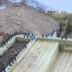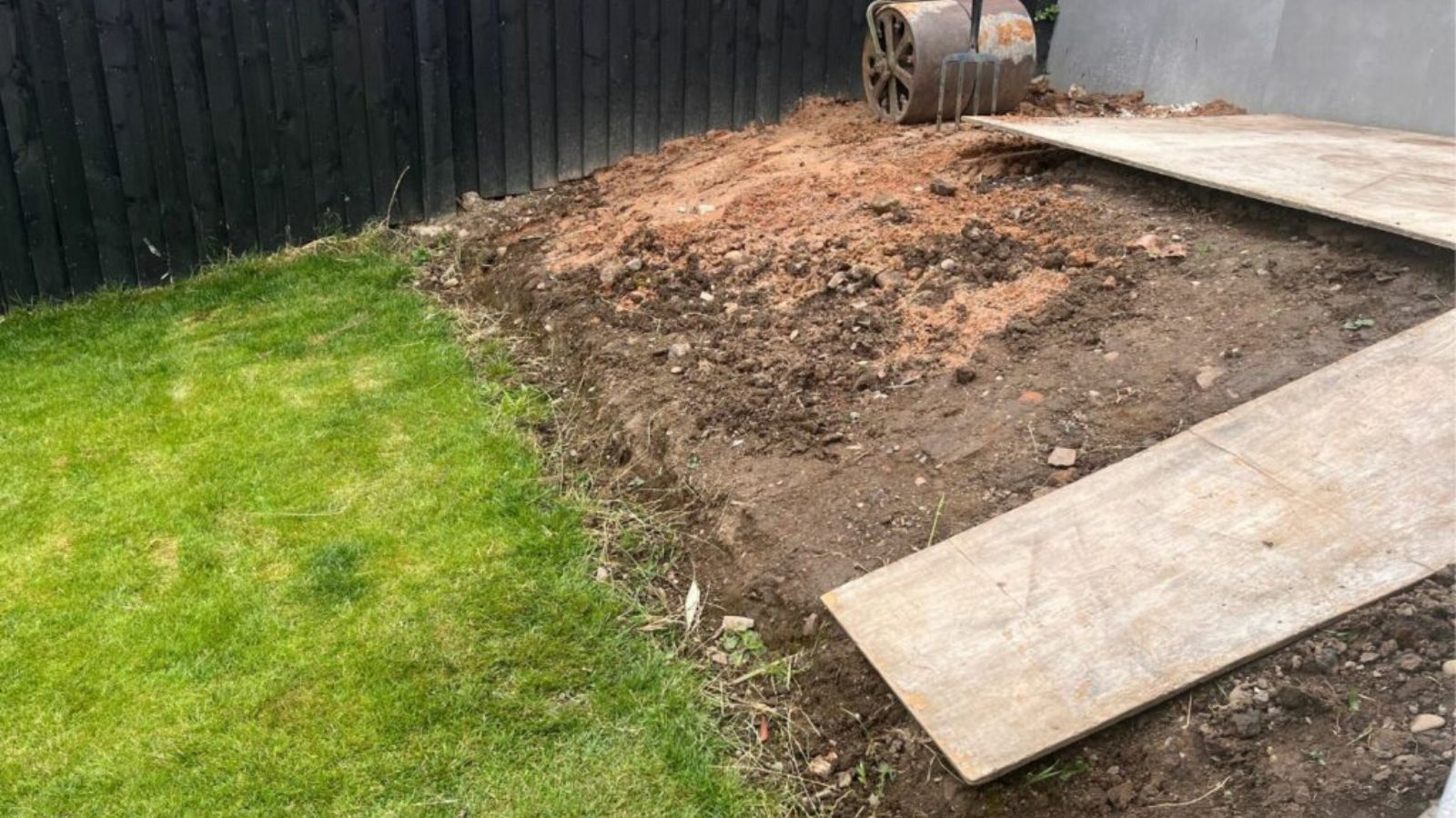 Het onderste deel van de helling moest ook volledig vlak worden gemaakt, zodat de eerste rij WoodBlocX correct kon worden geplaatst. Tijdens het graafwerk ontdekte Luke dat zijn afvoerpijp daar onder de grond liep. Eén blok werd op maat uitgesneden om over de pijp te passen en deze ongestoord te laten onder de keerwandstructuur.