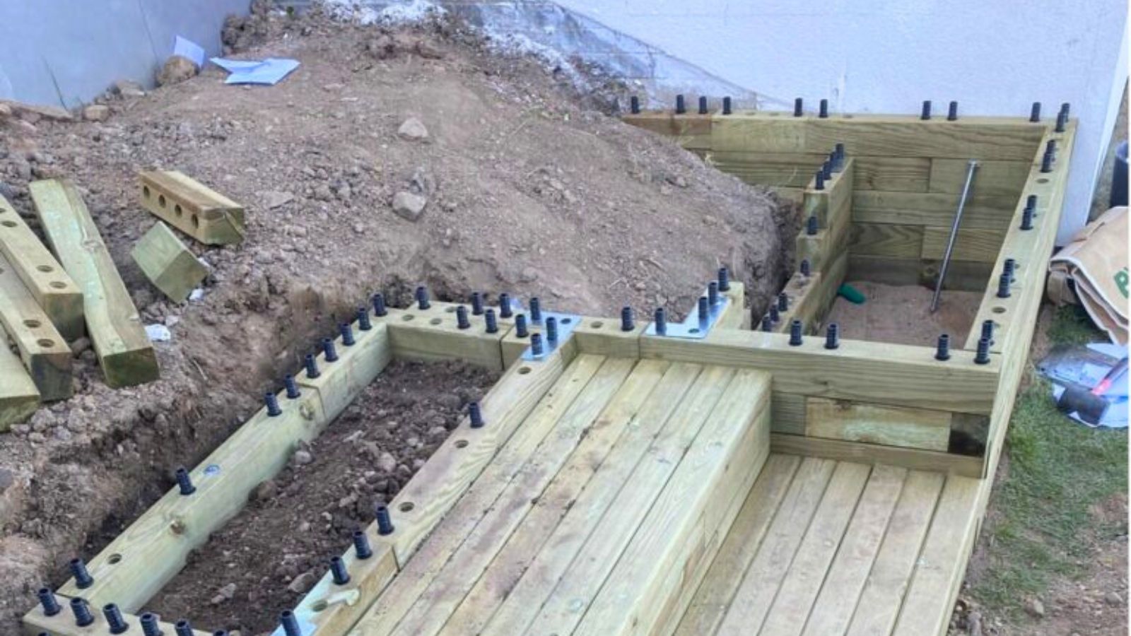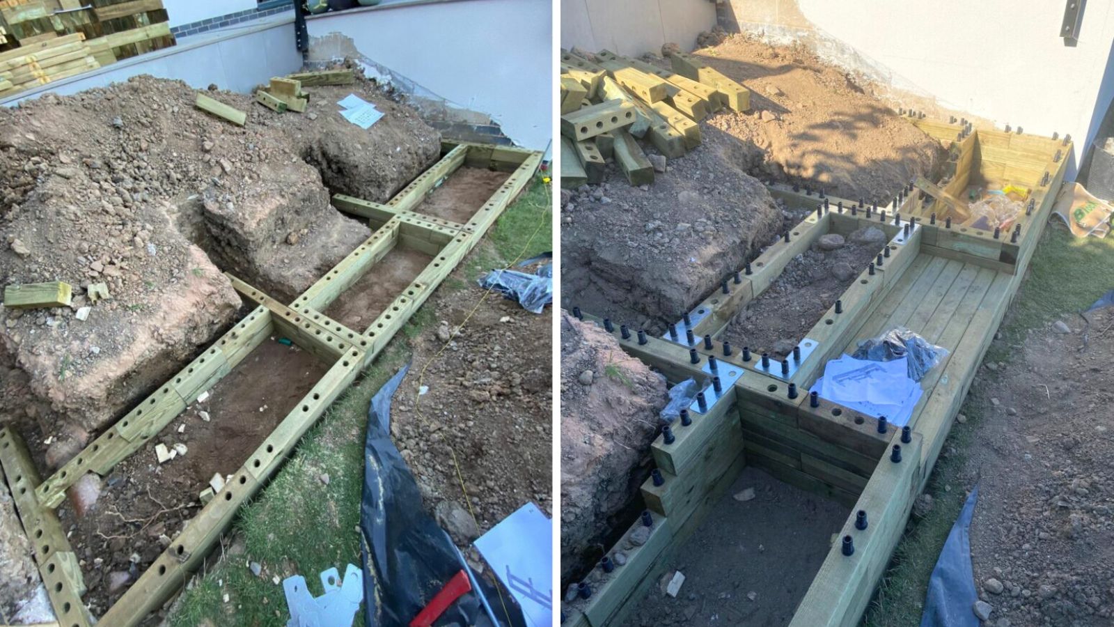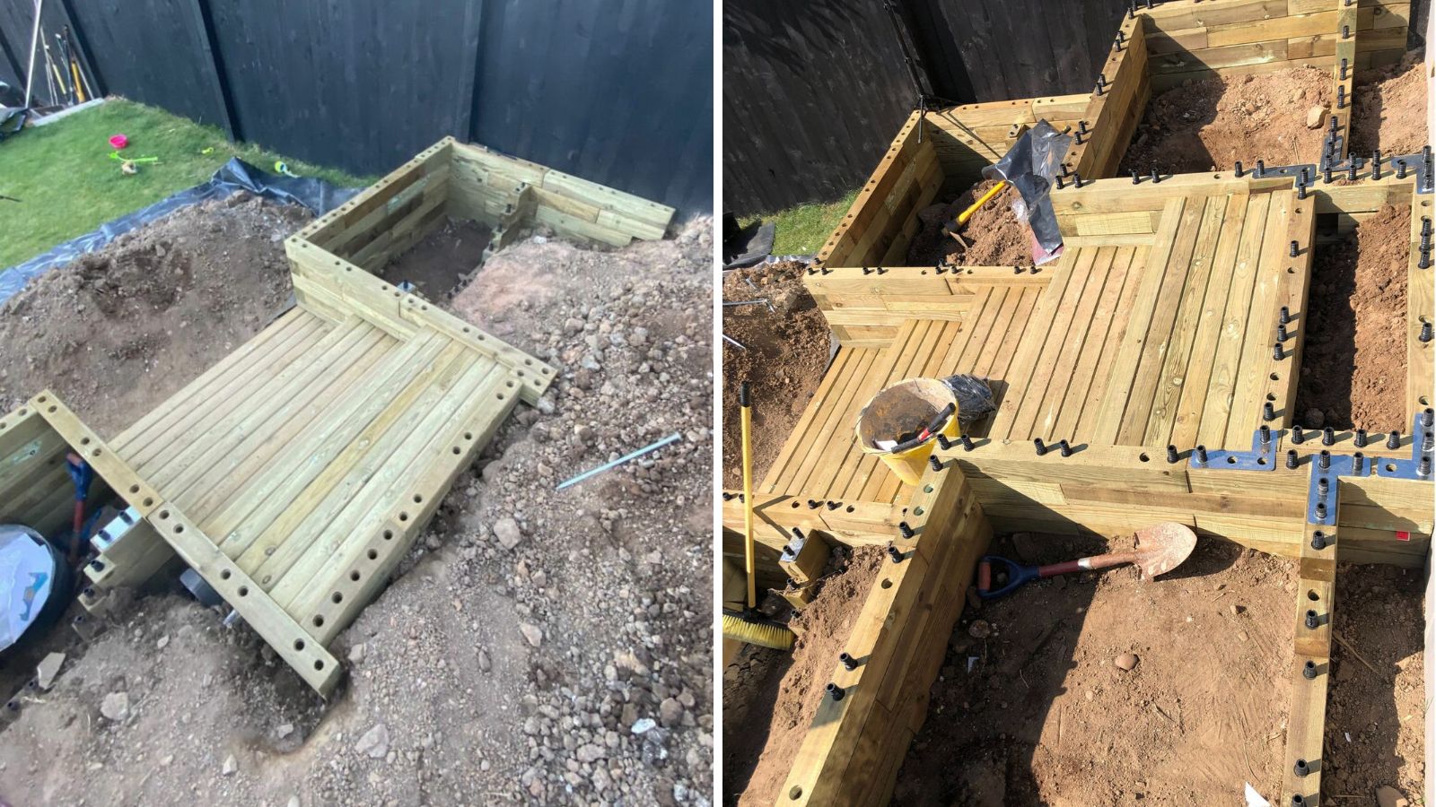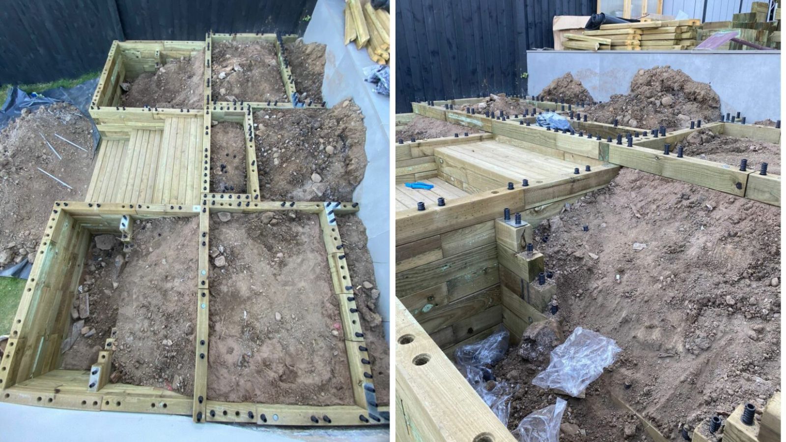 Voordat Luke ging bouwen, was het essentieel dat hij de grond voor zijn ontwerp voorbereidde. Hoewel de structuur slim was ontworpen en was afgestemd op de tuinhelling, moest Luke grond uitgraven om ruimte te maken voor de interne steunbalken zodat deze gelijk en vlak met de grond konden worden geplaatst. Deze fungeren als ‘verankeringen’ die helpen om de hele constructie veilig aan de grond te verankeren. Bekijk deze video om het grondvoorbereidingsproces te zien!