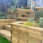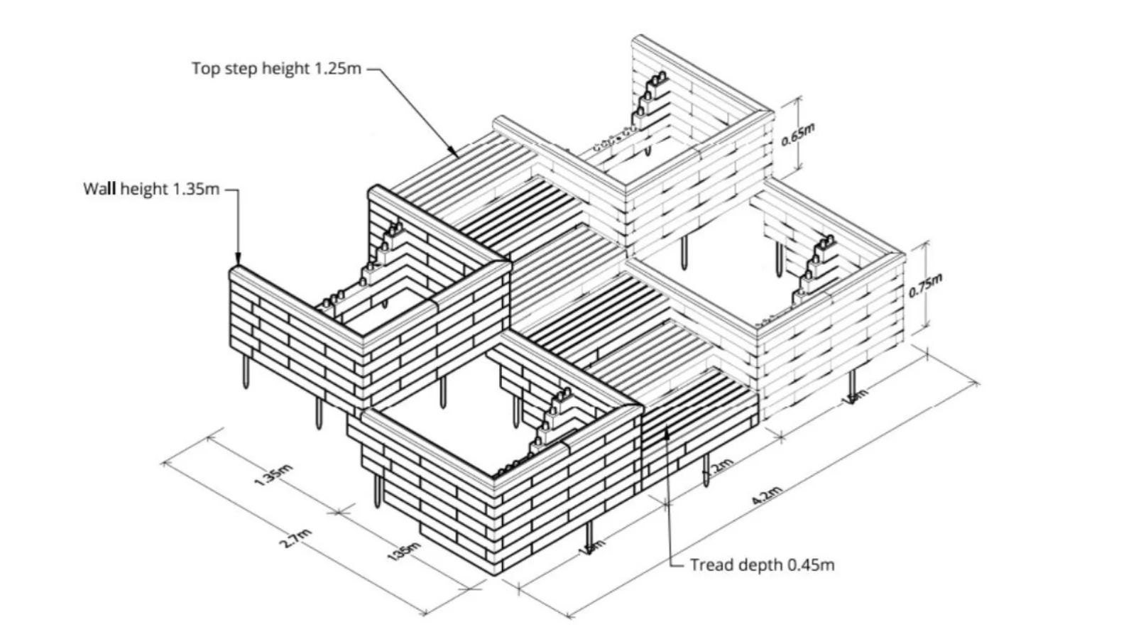 Ons deskundige team van WoodBlocX-ontwerpers ging aan de slag om een op maat gemaakte structuur voor de helling in Luke’s tuin te ontwerpen die kon worden gebouwd zonder al te veel grond te verwijderen. De bovenkant van de structuur moest ook gelijk eindigen met de bestaande hoogte van het terras. Het uiteindelijke ontwerp bestond uit twee grote plantenbakken op verschillende niveaus (om grond tegen te houden) aan weerszijden van de zes traptreden in het midden. De bovenste plantenbakken in het ontwerp maakten gebruik van de bestaande fundering van het terras om het benodigde aantal WoodBlocX te verminderen en zo de totale projectkosten te verlagen.