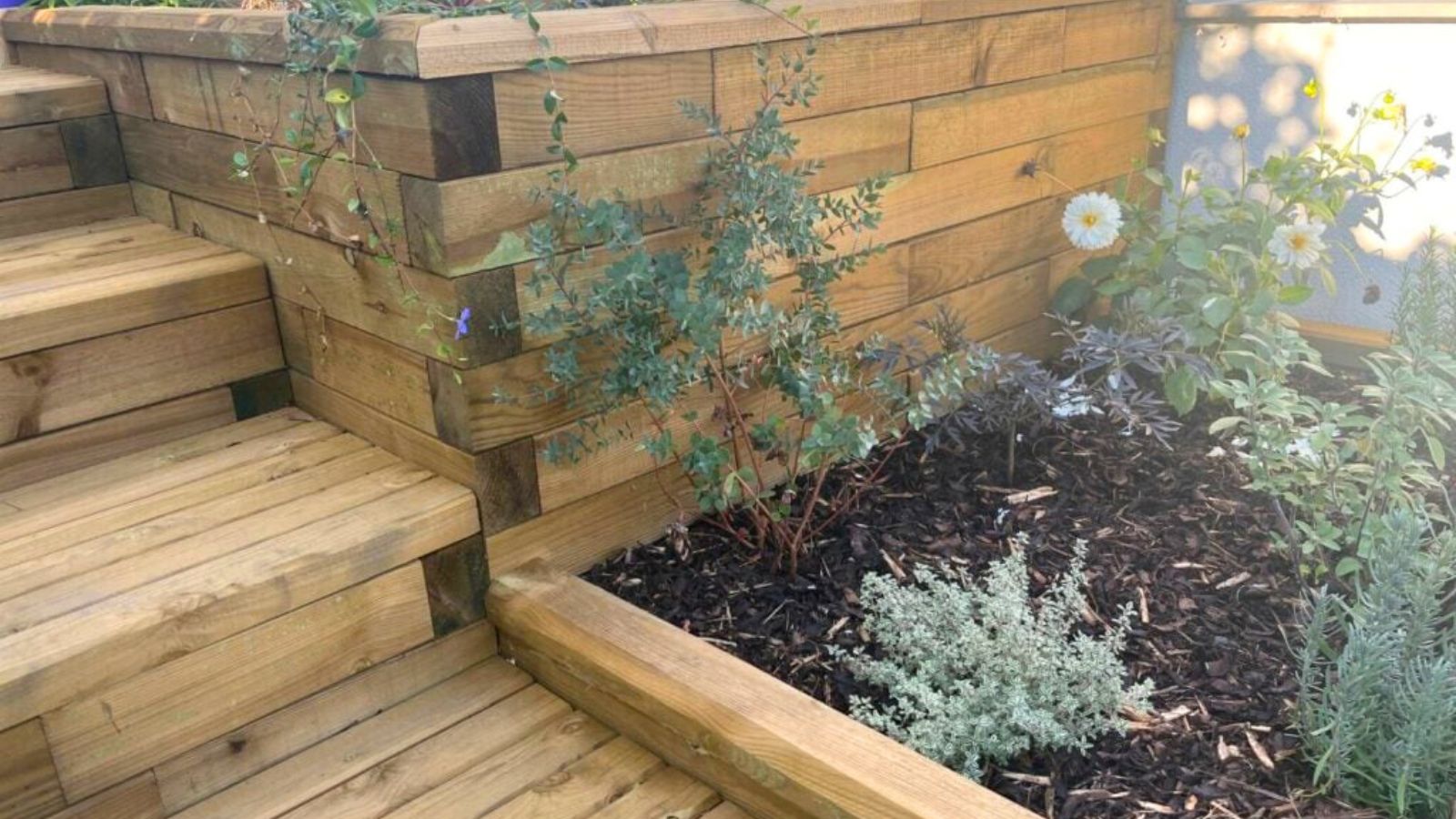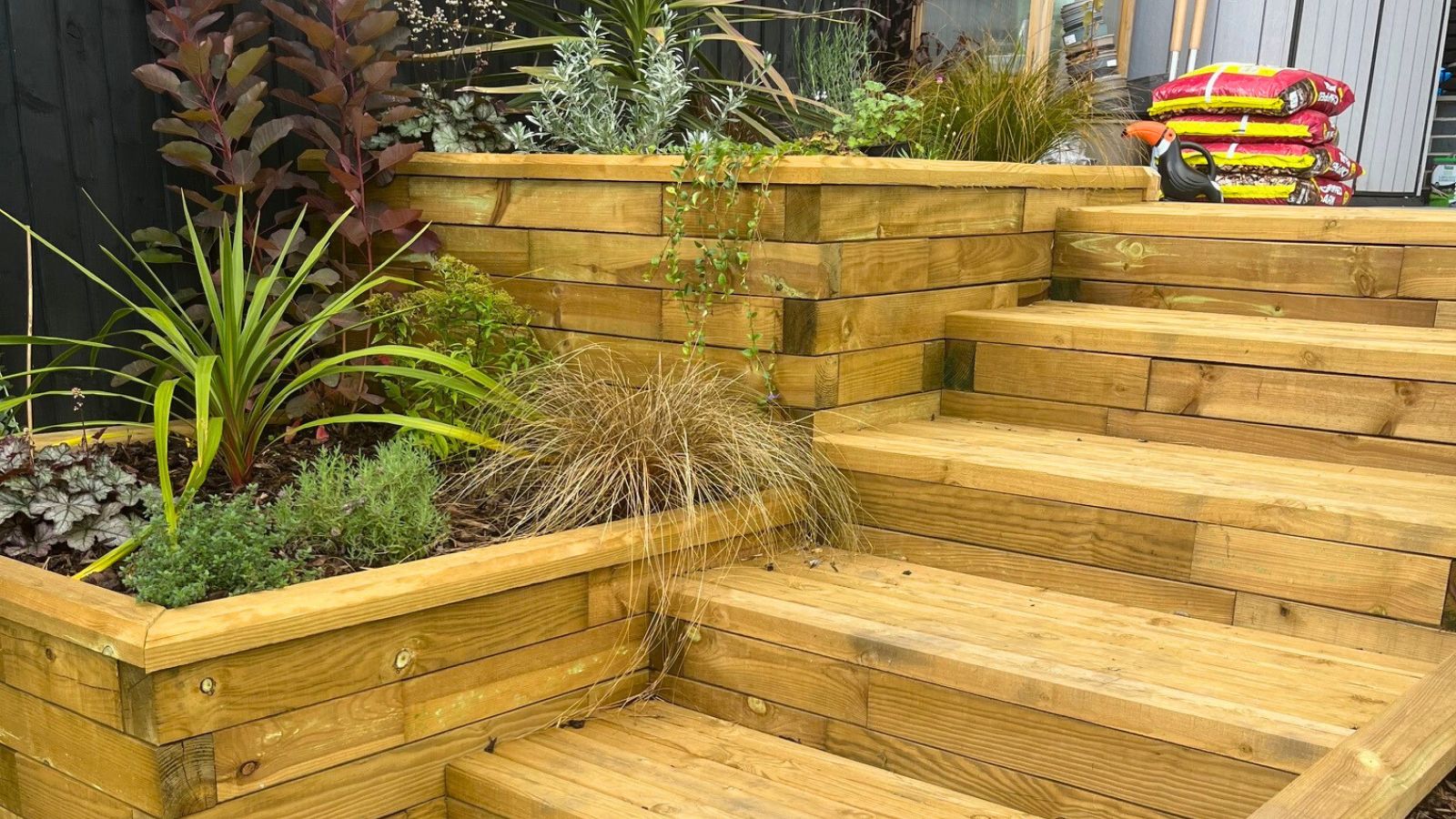 De uiteindelijke WoodBlocX-structuur is een fantastisch voorbeeld van hoe onze ontwerpers een structuur kunnen creëren die perfect bij een ruimte past zonder jouw tuin ooit te bezoeken! Luke’s ontwerp dient talloze doeleinden: het houdt de grond tegen in het hellende deel, biedt toegang via traptreden tot het onderste deel van de tuin en biedt volop beplantingsruimte voor een grote verscheidenheid aan struiken en planten. Onze traditionele afdekking geeft het terrasvormige ontwerp een zekere elegantie. En doordat het WoodBlocX-hout onder druk is behandeld, is de structuur eenvoudig te onderhouden en gaat deze nog jarenlang mee! Bekijk deze video om te zien hoe Luke zijn ontwerp bouwt.