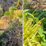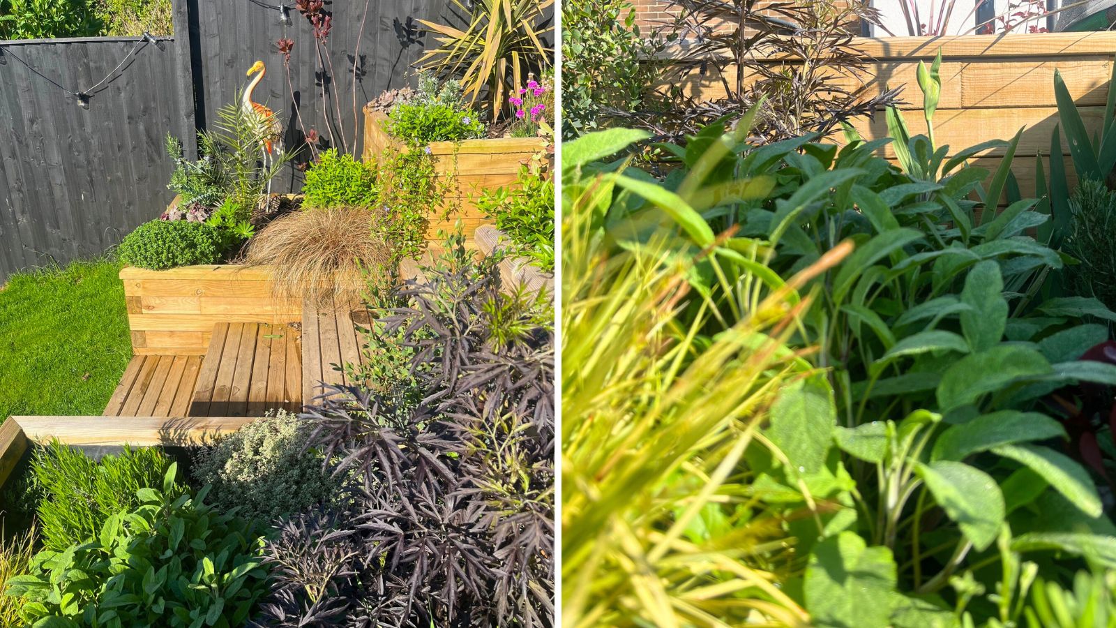 Luke heeft in de vierkante plantenbakken een verscheidenheid aan sierplanten gezet, die geselecteerd zijn om het hele jaar door consistentie en kleur te geven. Via de treden in het midden is deze beplantingsruimte goed toegankelijk voor onkruid wieden en verzorgen van de planten.