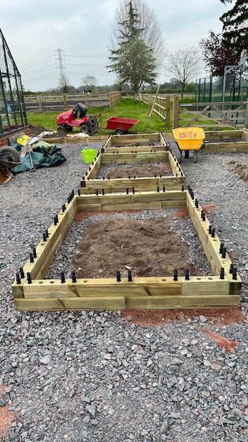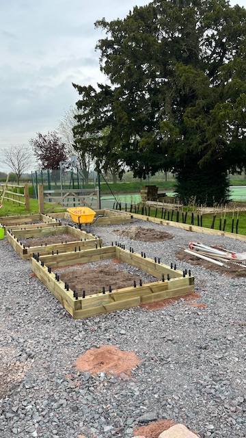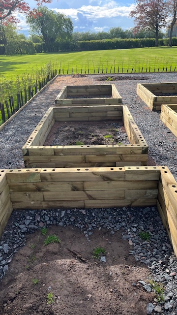 Elke moestuinbak werd gevoerd met een DPM-voering om het hout te beschermen. De bodem van elke bak werd gevuld met een laagje grind van 10 mm, daarna een laag houtsnippers en vervolgens met een mix van teelaarde, compost en goed verrotte mest om de bakken te vullen.