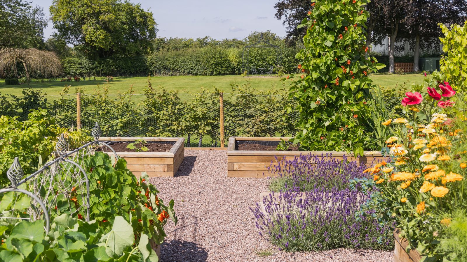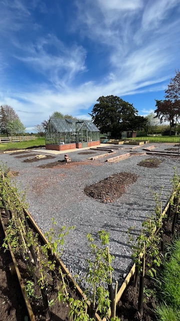 Dankzij Steve’s planning en voorbereiding is er nu een prachtige en productieve moestuin waarin vele soorten groenten, kruiden en ook snijbloemen worden gekweekt. De paden zijn aangelegd met zelfbindend grind en met grote bakstenen langs de randen.