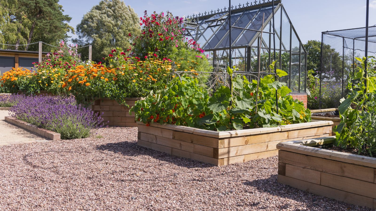 De grote kweekruimte vergt relatief weinig onderhoud dankzij de grindpaden en de verhoogde moestuinbakken die het hele jaar door goed toegankelijk en moddervrij zijn.