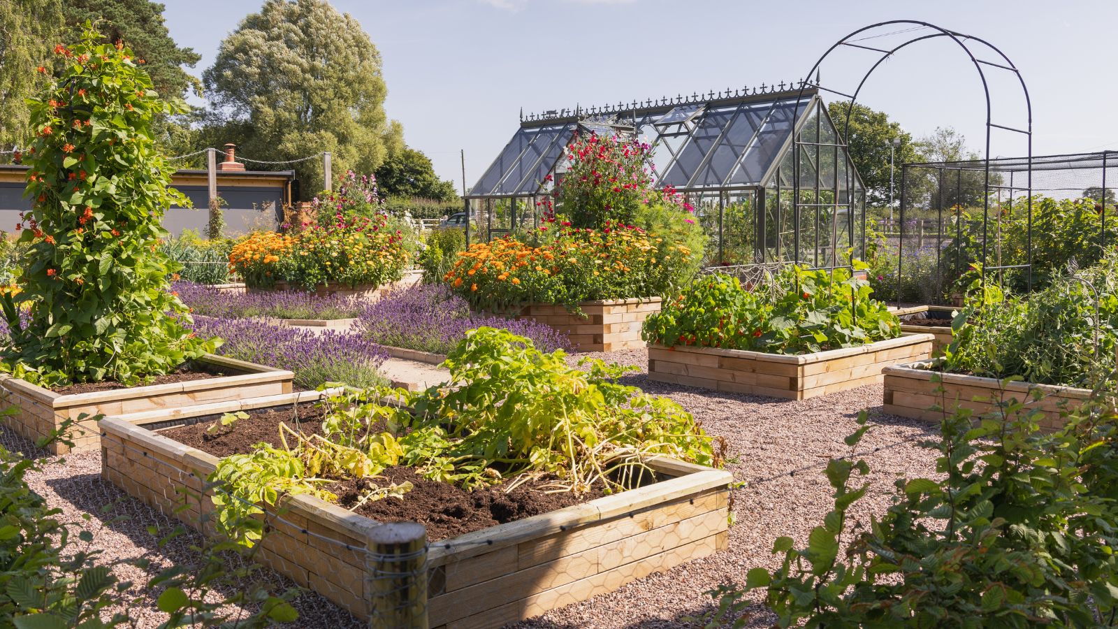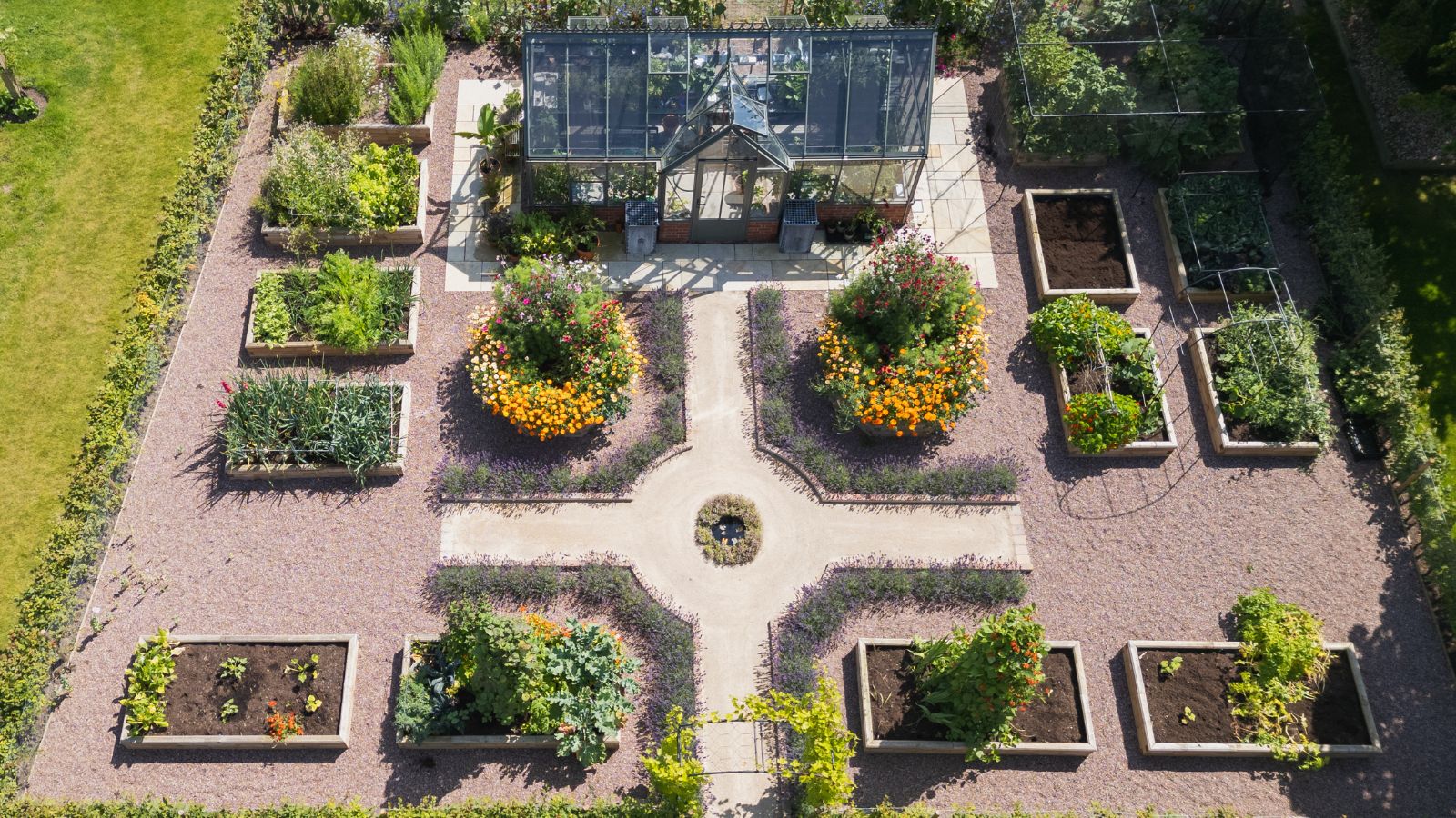 Door de bijna symmetrische indeling van de tuin met de kas in het midden is dit een schoolvoorbeeld van hoe een grote moestuin eenvoudig op kleinere schaal kan worden nagebouwd als je dat zou willen.