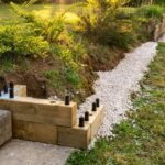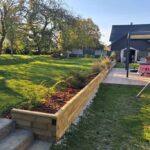 Na het aanbrengen van een beschermende voering aan de binnenkant van de wand en over de interne steunbalken, zorgde Thibaut voor voldoende drainage om ophoping van water te voorkomen. Aan de basis van de keerwand werd een laag grind aangebracht, voordat de ruimte met aarde werd gevuld en er planten en struiken werden gezet. Thibaut koos ervoor om de wand af te werken met onze traditionele afdekking met afgeschuinde randen die iets uitsteken en onder verstek gezaagde hoeken. Lees meer over onze afdekkingsopties.