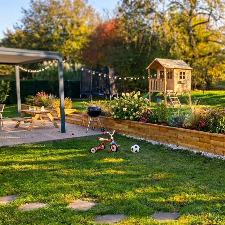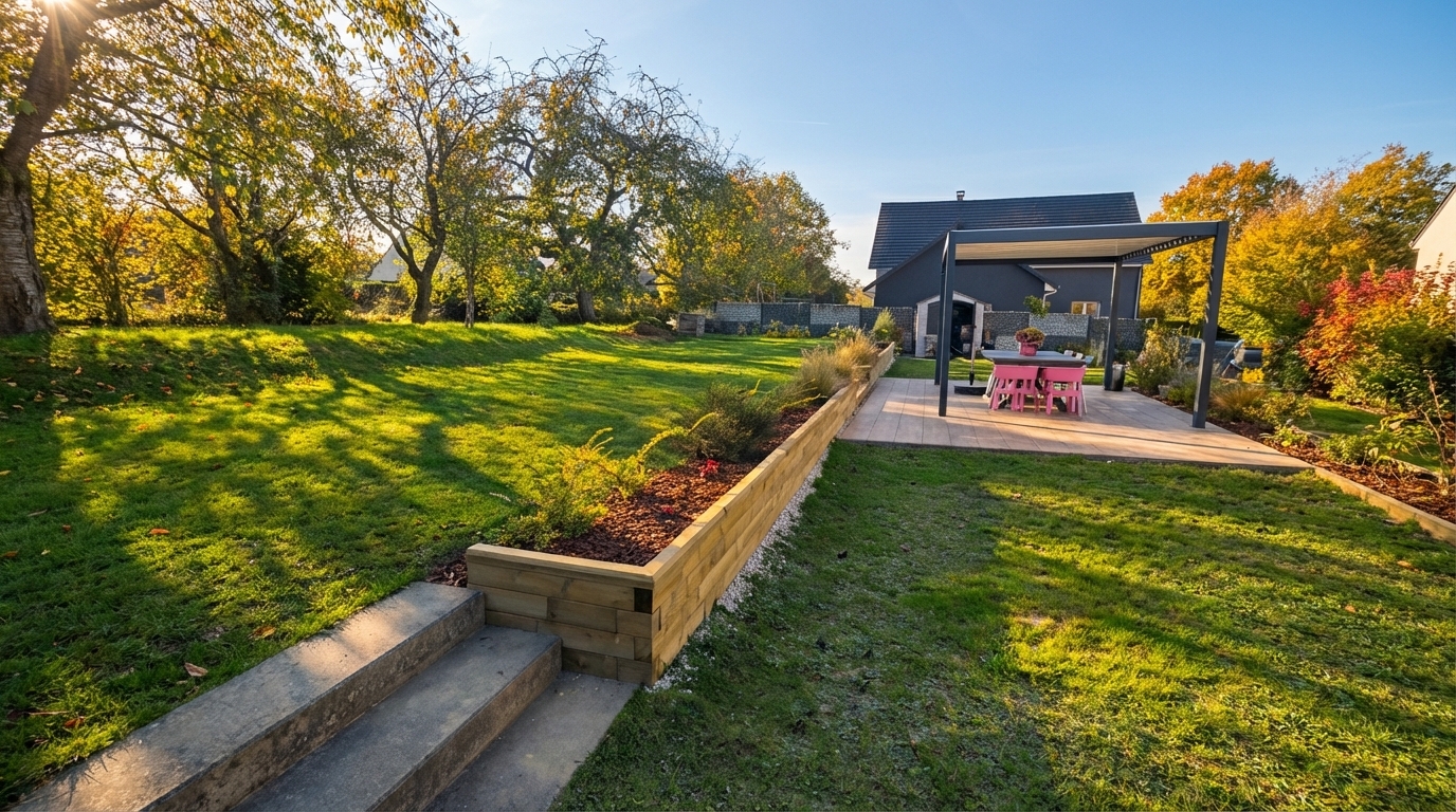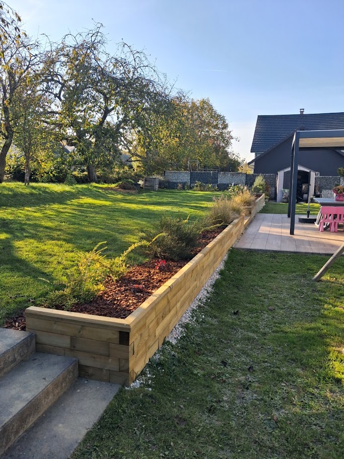 De tuin van Thibaut bestond uit een lager gelegen betegeld terras met daarboven een groot grasveld. De twee gebieden waren verbonden door een kleine helling met minimale tuininrichting. Thibaut was op zoek naar een oplossing om de twee delen met elkaar te verbinden, rekening houdend met de kleine helling. Een WoodBlocX-keerwand biedt de nodige flexibiliteit zodat je altijd de juiste afmetingen voor de ruimte kunt kiezen, en biedt ook een sterke, duurzame en aantrekkelijke structuur die vele jaren meegaat.