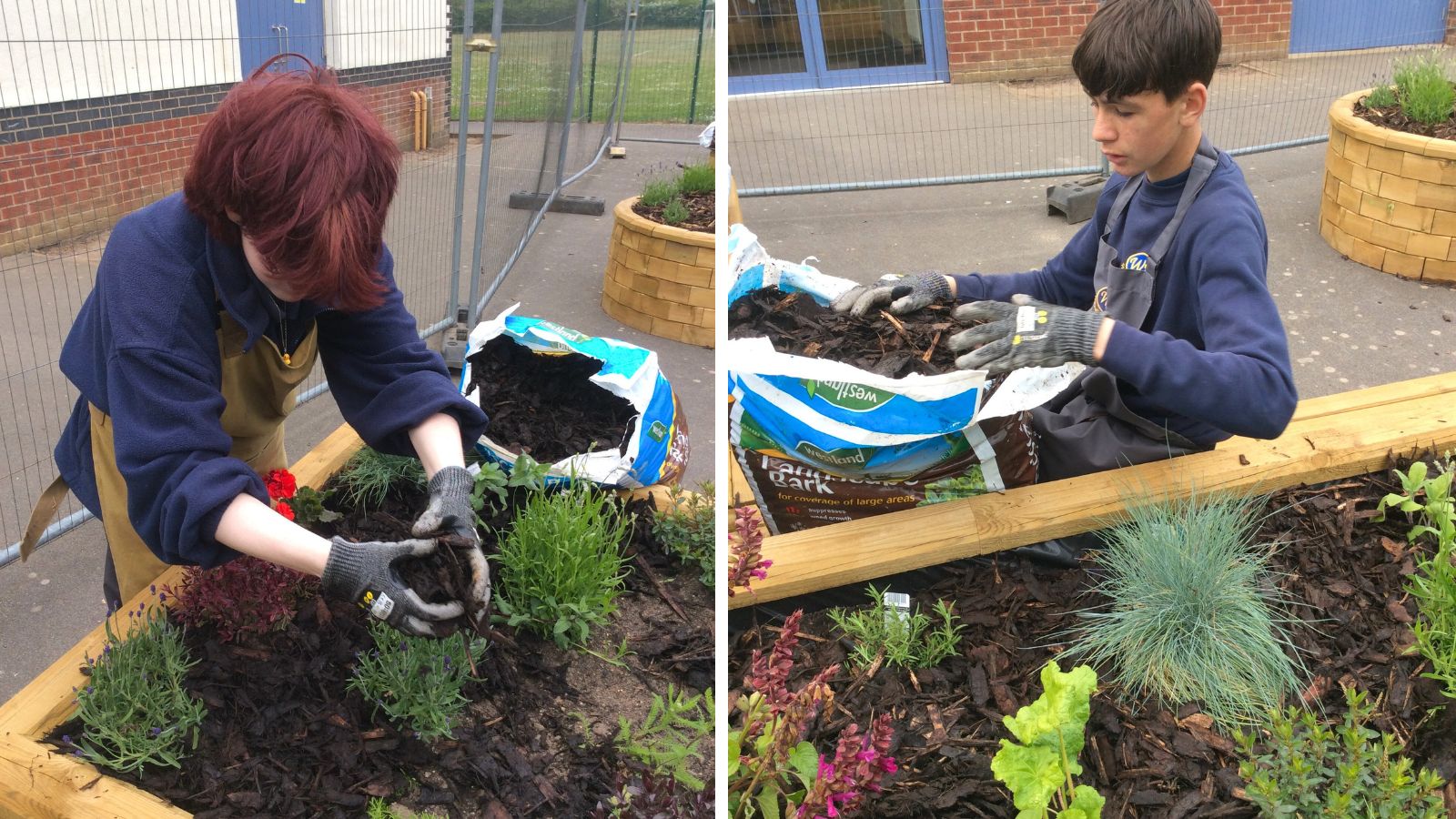 Ten slotte werden de verhoogde bakken met aarde gevuld. De leerlingen plantten daarna verschillende bloemen en struiken voordat ze ter afwerking een laag boomschors toevoegden.