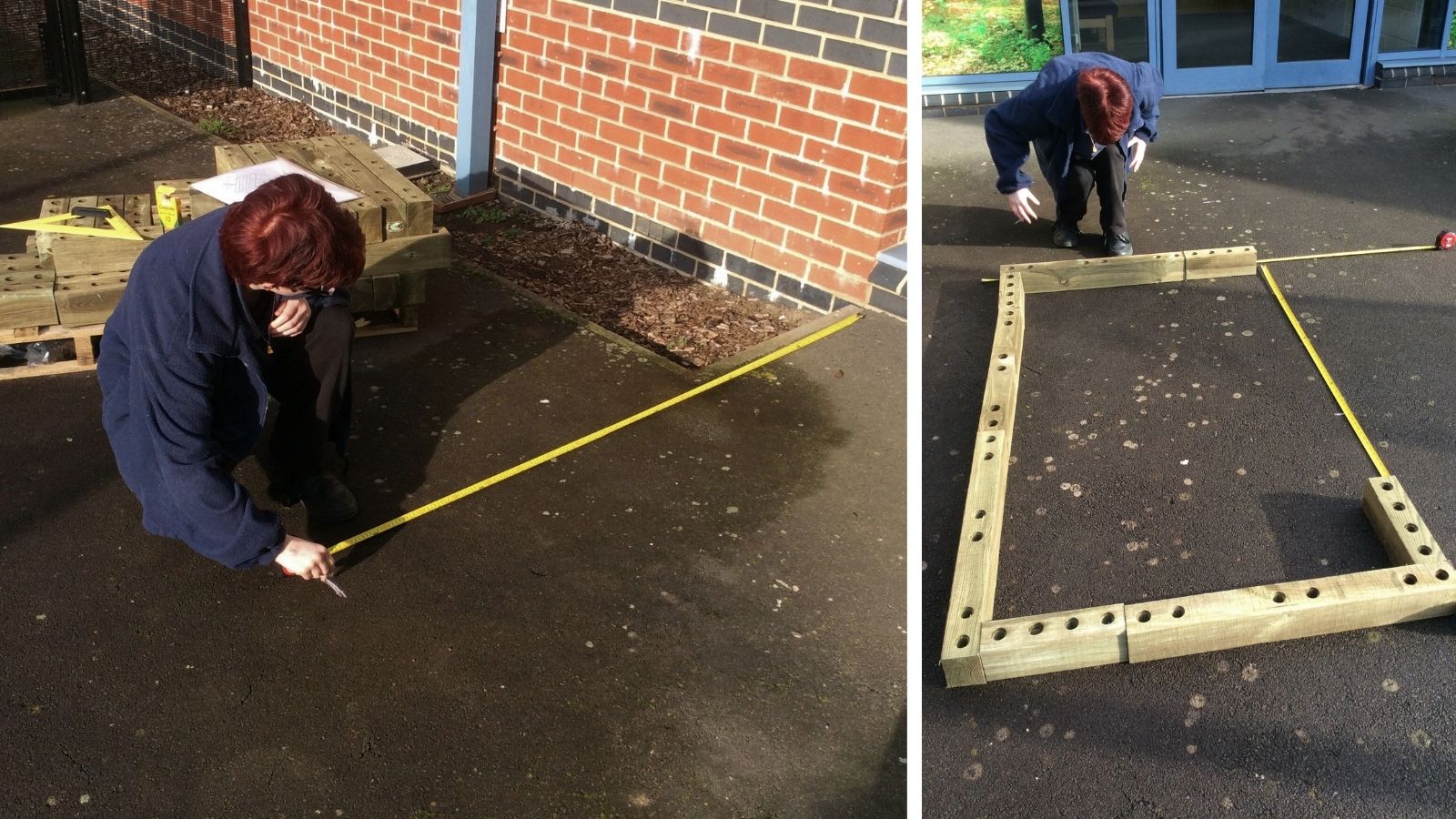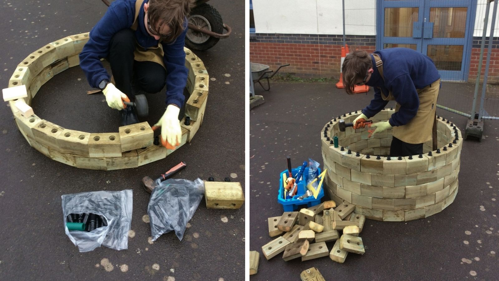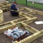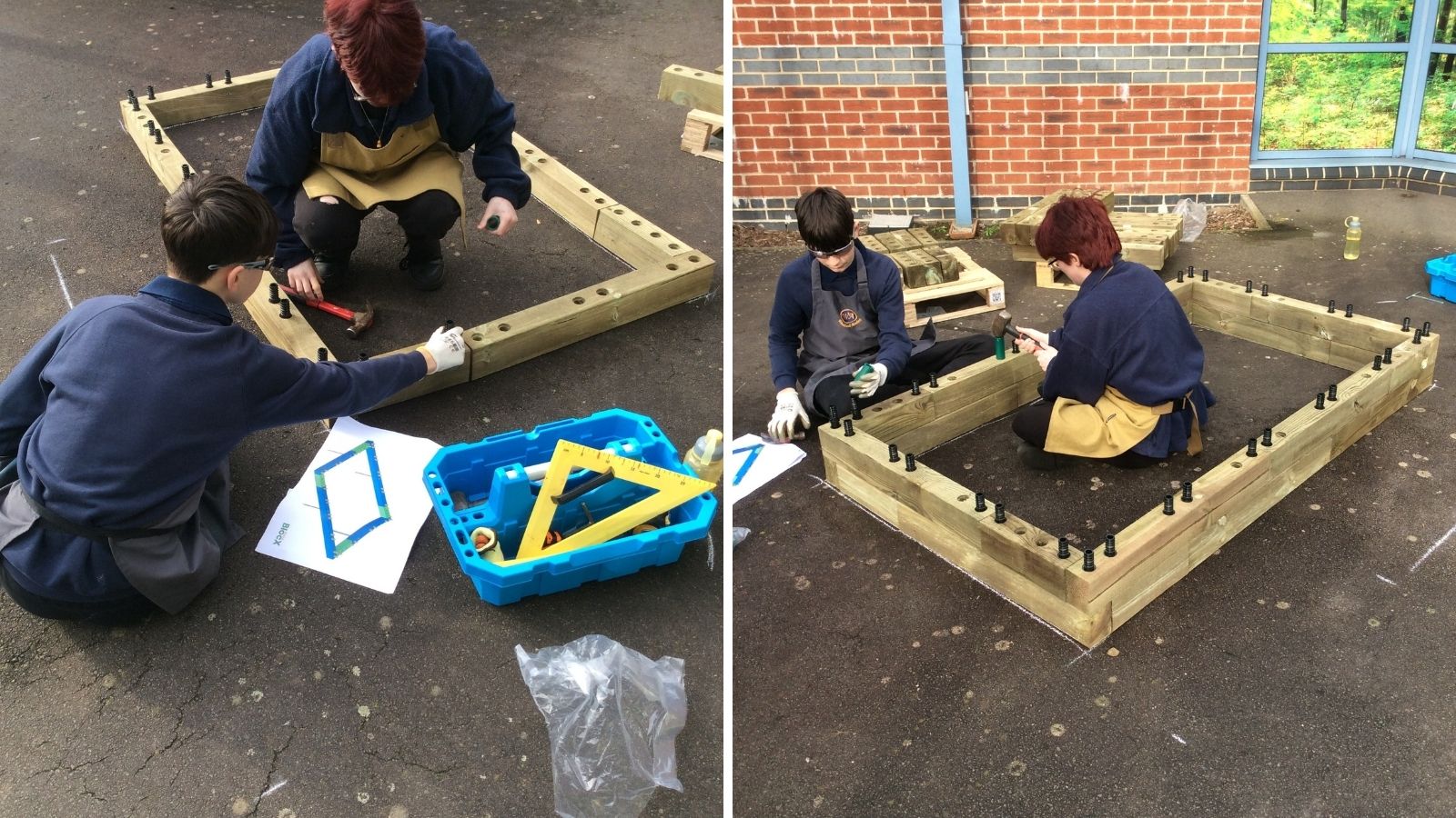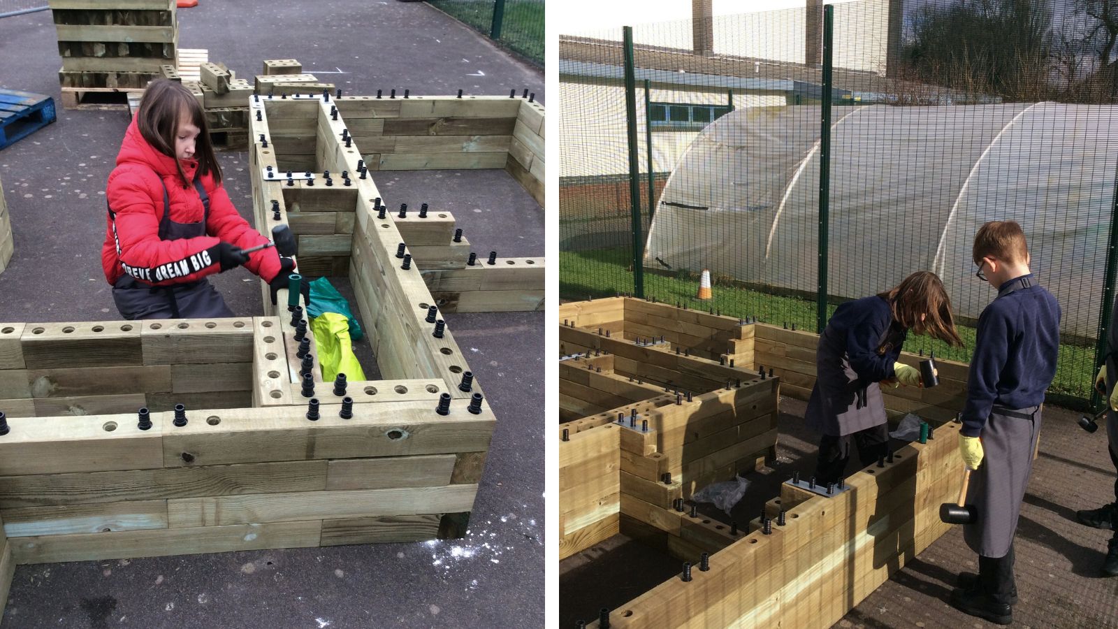 Omdat de plantenbakken op een geasfalteerd schoolpein werden gebouwd, was er minimaal voorbereidingswerk nodig. Er werd zorgvuldig gekeken welke delen van het plein het vlakst waren om het bouwen met WoodBlocX te beginnen. De kinderen waren bij alle aspecten van het project betrokken; ze begonnen met het opmeten van de ruimtes om ervoor te zorgen dat de verhoogde bakken op de juiste plaats zouden worden gebouwd. Bij het bouwen op een harde ondergrond kun je ervoor kiezen om hoekbeugels aan je bestelling toe te voegen om de WoodBlocX-structuur aan de grond te verankeren.