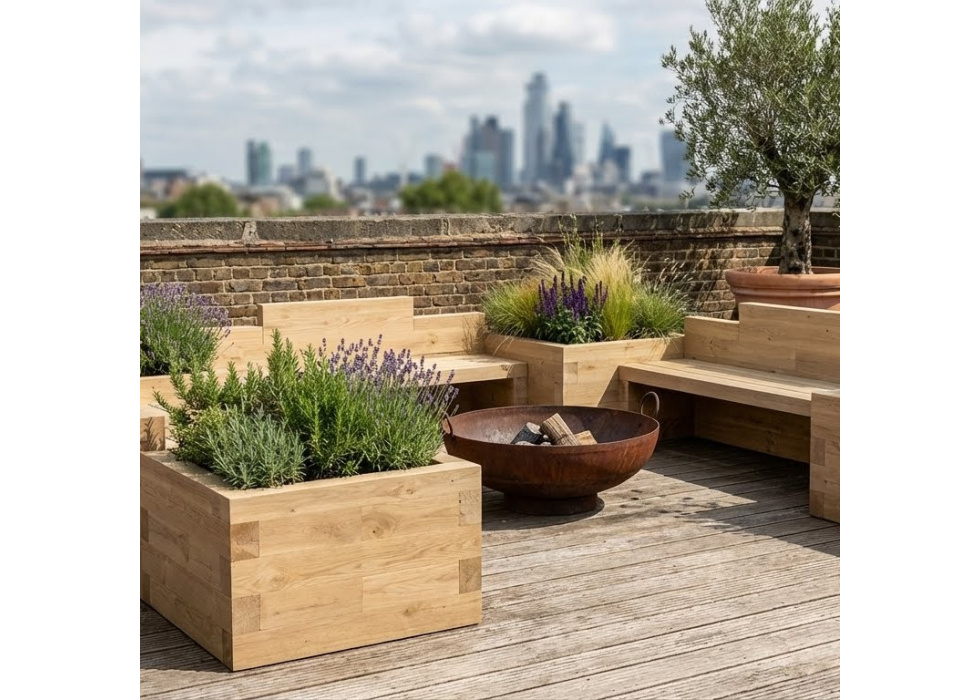 De drie prachtig uitziende houten tuinbanken worden omgeven door vier plantenbakken om bloemen, struiken, kleine bomen of wat je maar wilt te laten groeien!