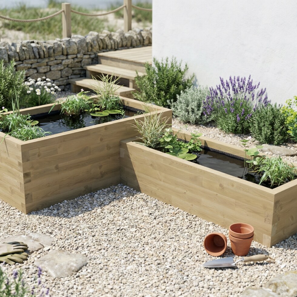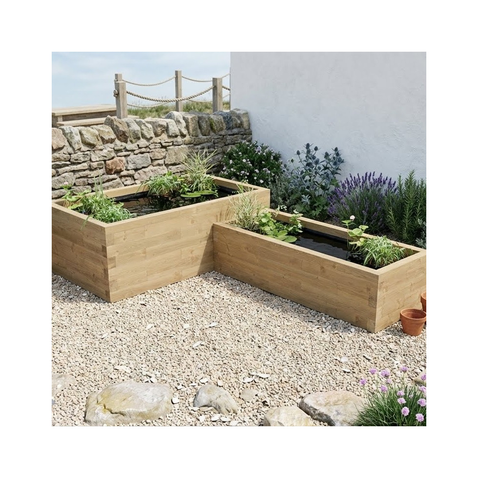 Dit slimme WoodBlocX-ontwerp bevat twee rechthoeken om een ​​L-vormige verhoogde vijver te creëren. Vanwege waterdrukbeperkingen bestaat dit ontwerp uit twee afzonderlijke vijvers en heeft de perfecte vorm voor een hoekje van je tuin of terras. Een geweldige manier om een ​​stijlvolle en onderhoudsvriendelijke watervijver aan je buitenruimte toe te voegen.