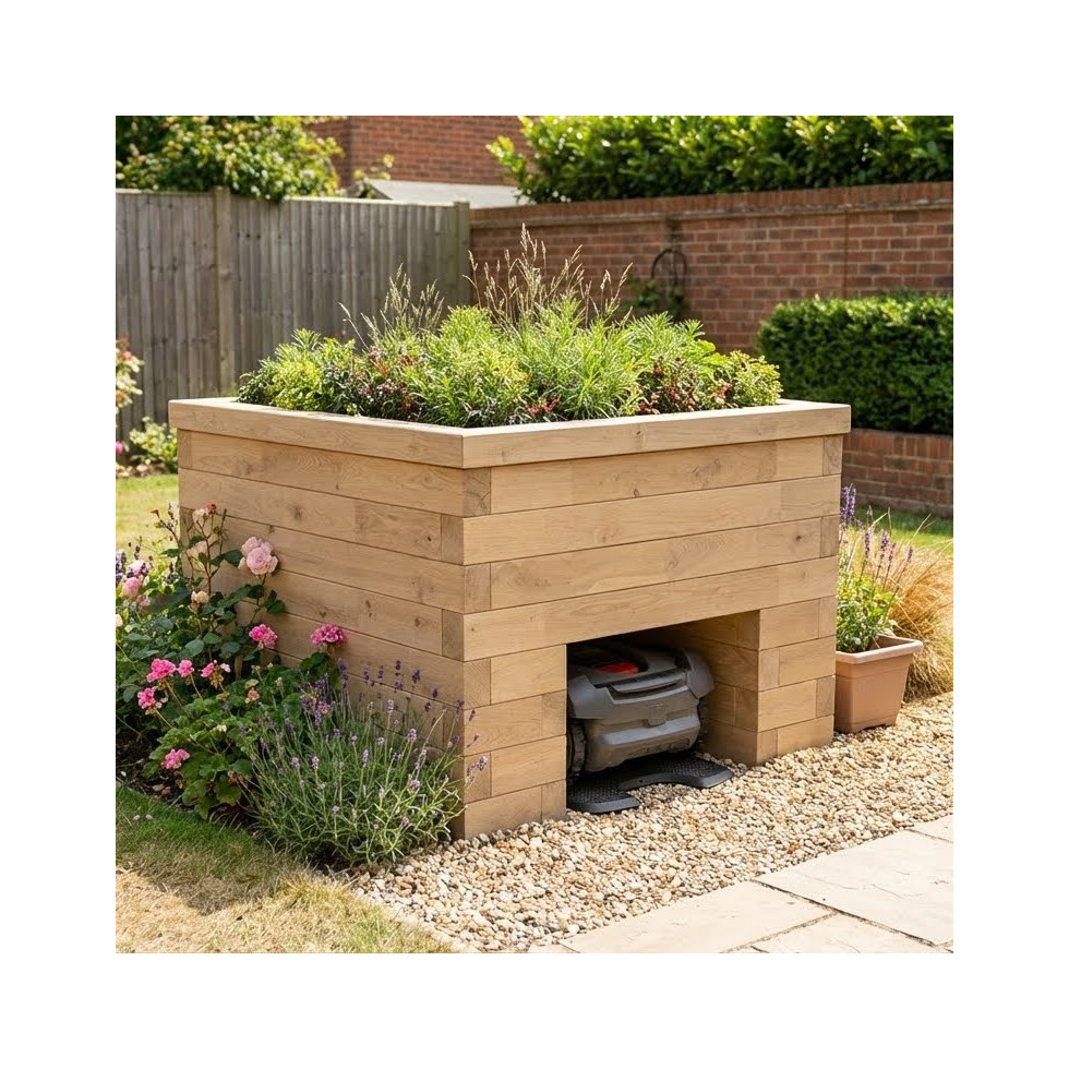 Dit robotmaaierhuis met plantenbak is ontworpen voor de meeste maten robot grasmaaiers en ziet er ook nog eens goed uit. Het biedt beschutting aan de onderkant en volop beplantingsruimte erboven voor bloemen of het kweken van groenten. Het enige wat je nodig hebt is een klomphamer voor het bouwen terwijl je onze eenvoudige laag-voor-laag instructies volgt.