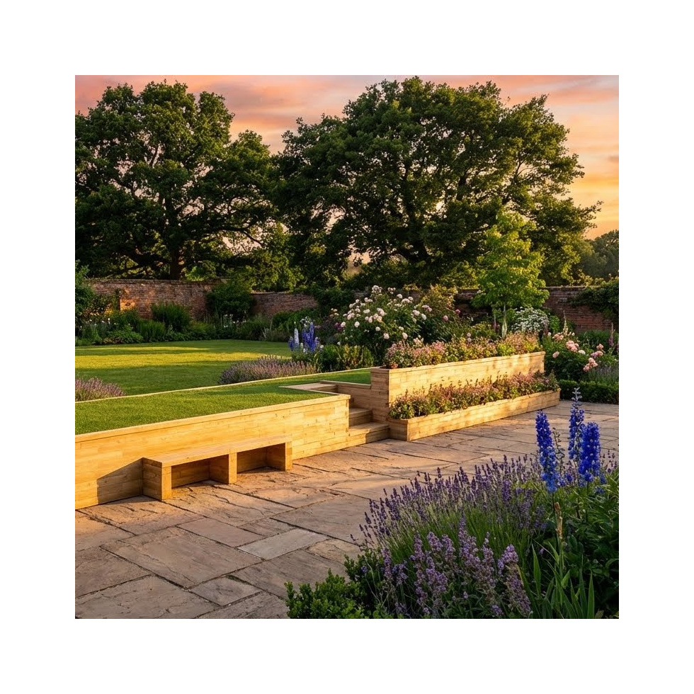 Deze lange keer muur was deel van een grootscheepse tuinherziening met als doel een glooiende tuin in een opgedeelde tuin met twee niveaus te transformeren. Aan de rechterkant is extra ruimte voorzien voor randbeplanting van planten, bloemen of kruiden. De linkerkant biedt zitgelegenheid met geïntegreerde zitplaatsen. Deze kit werd ontworpen voor een klant. Als u een op maat gemaakt ontwerp nodig heeft, dan gewoon contact met ons op. Het WoodBlocX-team helpt u graag verder met het maken van een ontwerp voor een keermuur voor uw tuin. Neem contact met ons op via onze gratis Design Service.