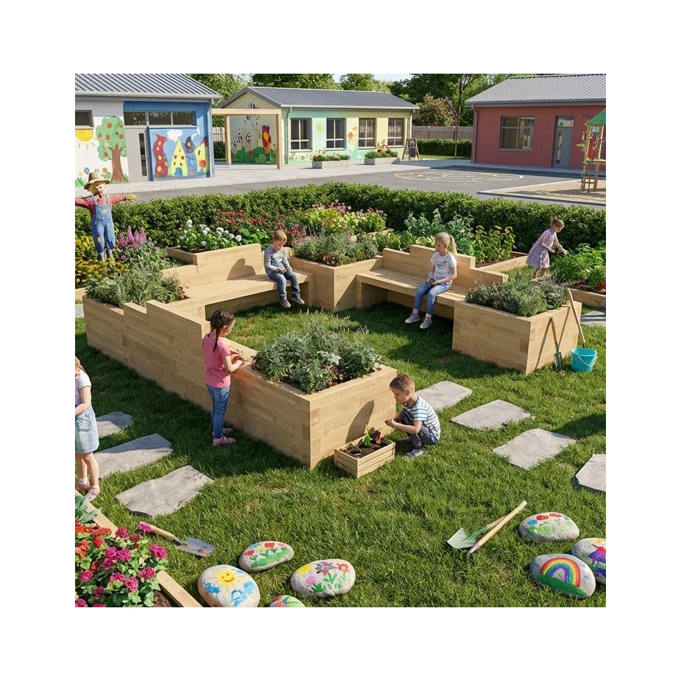 Deze kindertuinbank met moestuinbakken volgt hetzelfde idee als onze deze hier, maar dan nog groter! Dit ontwerp heeft langere banken zodat nog meer kids hier samen de tijd van hun leven kunnen doormaken. Deze U-vormige zitboek is zeer geliefd voor gebruik in scholen, privétuinen, jeugdclubs en verenigingen en geeft de kinderen de nodige ruimte om aan de slag te gaan in de tuin. Maar ook voor volwassenen kan deze tuinset een ideaal toevluchtsoord zijn om te genieten van een rustige namiddag. Ben je nog niet helemaal verkocht? Bezoek onze gratis online ontwerpservice vandaag nog en creëer de tuin van je dromen. Je kan ook door ons volledige assortiment bladeren vanop deze overzichtspagina.