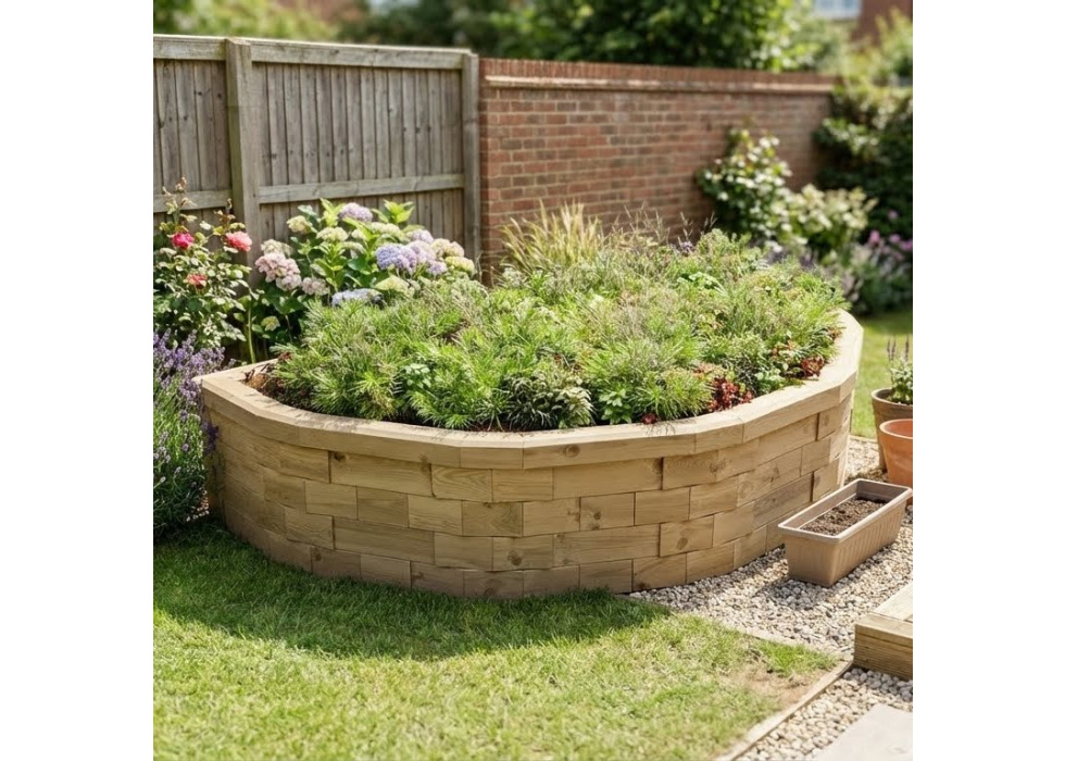 A semicircular raised bed was a good solution to make a visual feature where the soul was clay and poor draining. The woodblock system is good looking but relatively easy to construct (The instructions are very clear with some good tips to make the build straightforward)