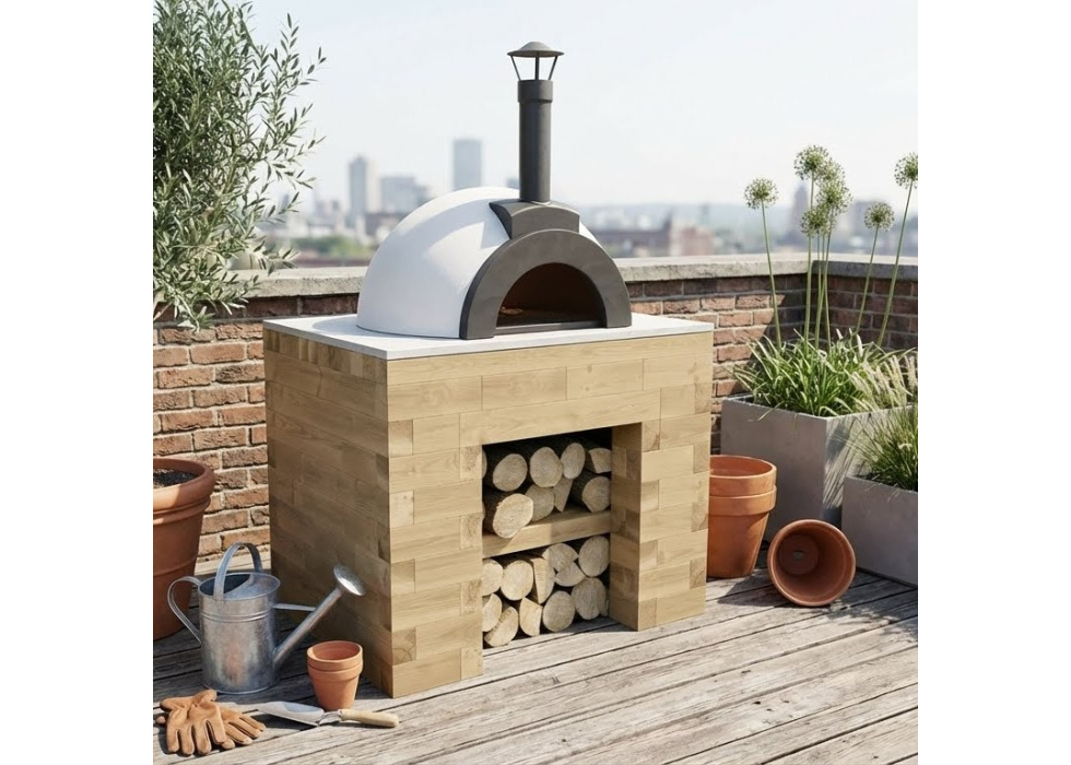 Kies een tafel voor je pizzaoven waar je trots op kunt zijn! Deze oerdegelijke houten tuintafelkit met ruimte eronder voor het opbergen van stookhout zal je buitenkookervaring met een pizzaoven transformeren.