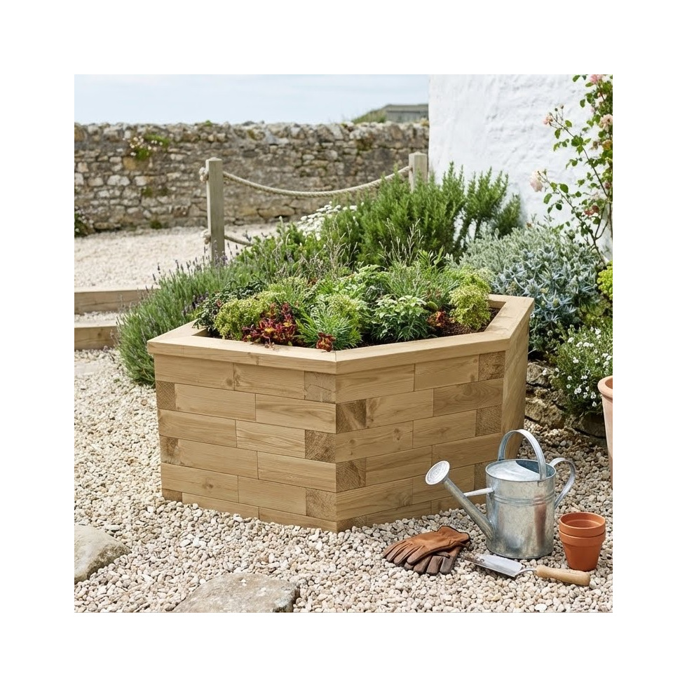 Deze zeshoekige houten plantenbak biedt een verfrissend alternatief voor de typische rechthoekige of vierkante modellen. Het moderne design werd vooral ontworpen om als centraal stuk in het middelpunt van de tuin te pronken, maar kan natuurlijk ook gebruikt worden om ruimtes in moeilijker te bereiken plaatsen van de tuin optimaal te benutten. Bekijk ook zeker eens ons volledig aanbod aan houten plantenbakken voor meer ideeën en inspiratie. Als je zelf liever de afmetingen en vorm van je plantenbak tot in de puntjes wil bepalen, kan je onze gratis Design-service eens uitproberen.