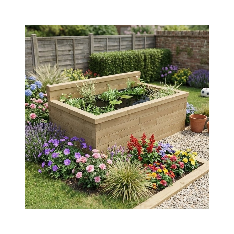 Transformeer de muren in je tuin met dit verhoogde vijverontwerp van WoodBlocX. Ideaal om direct aan een schuur of omheining te bouwen. De perfecte manier om een ​​onderhoudsvriendelijke vijver in je tuin op te nemen.
