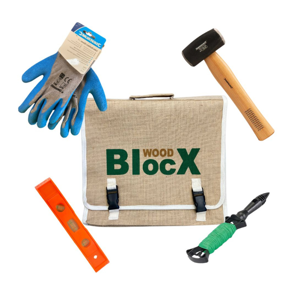 De WoodBlocX starter kit herbergt alle tools die je nodig hebt om zelfs de meest ingewikkelde WoodBlocX-structuur te bouwen.